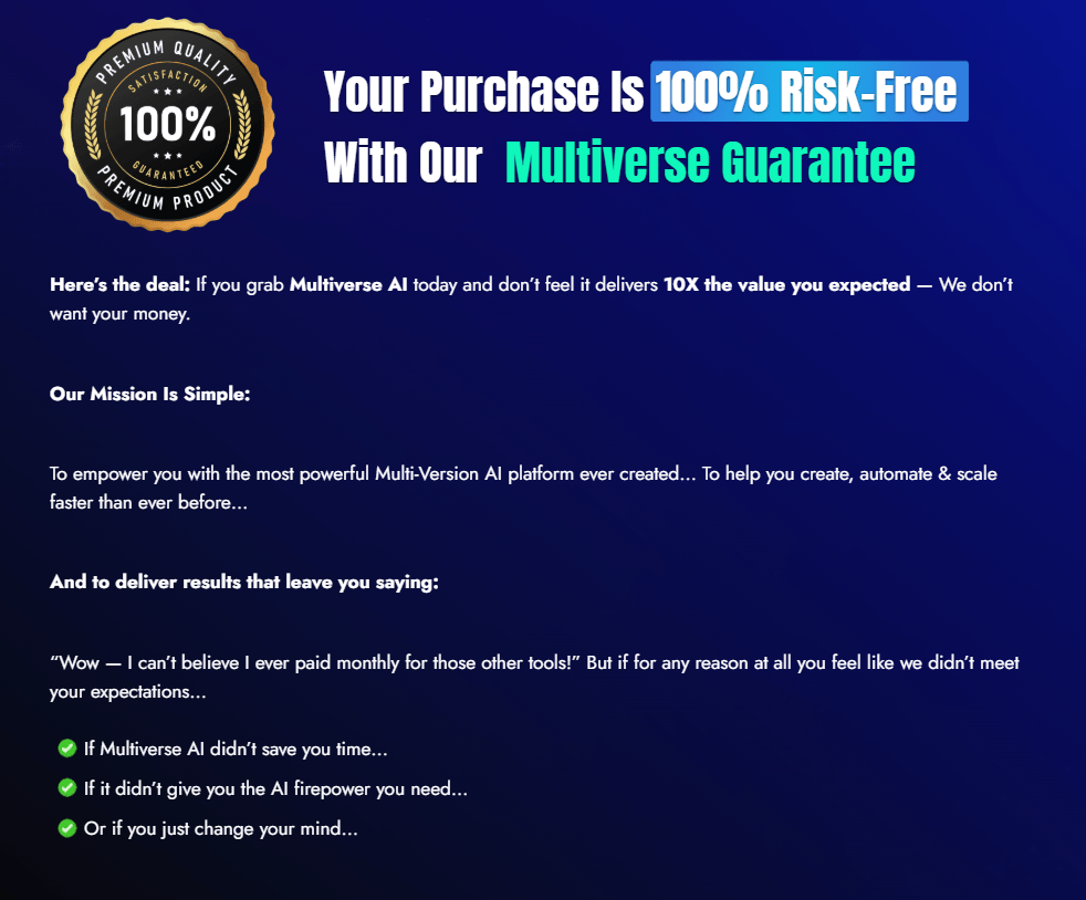 If for any reason you don’t love Multiverse AI, just contact our support team — and we’ll refund every penny.